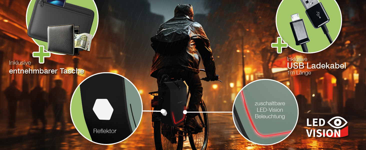 - Erhöhte Sichtbarkeit: Die integrierten Reflektoren und zuschaltbare LED-Beleuchtung sorgen für maximale Sicherheit im Straßenverkehr.