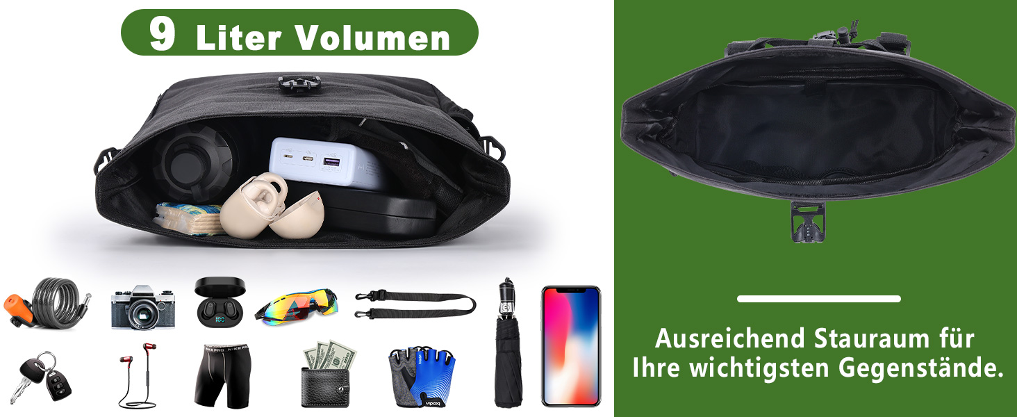 Die Lenkertasche für Ihr Fahrrad bietet ein großzügiges Volumen von 9 Litern, perfekt für Pendler und Kurztrips. Sie hat genügend Platz für all Ihre Fahrradzubehörteile, einschließlich Handy, Geldbörse, Snacks und sogar einen Regenschirm. Diese durchdachte Tasche sorgt dafür, dass Sie alles, was Sie brauchen, griffbereit und organisiert haben.