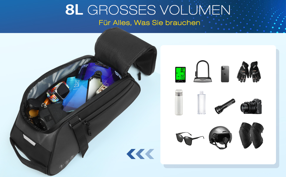 Die toptrek Gepäckträgertasche bietet Ihnen großzügige 8 Liter Stauraum und ist somit ideal für die Organisation Ihrer täglichen Essentials. Sie ist ausgestattet mit einer Haupttasche, zwei Seitentaschen und einer oberer Tasche mit Reißverschluss, sowie zwei inneren Netztaschen. Diese durchdachte Aufteilung ermöglicht es Ihnen, alles Wichtige schnell und unkompliziert zu finden – perfekt für Tagesausflüge oder den Weg zur Arbeit.